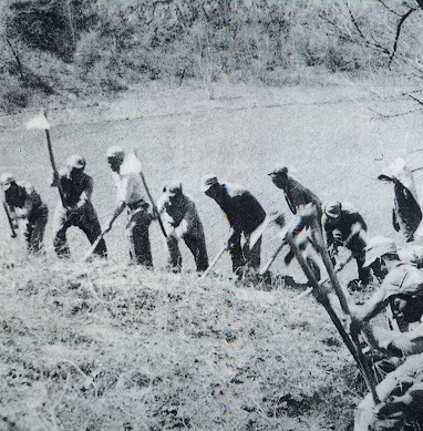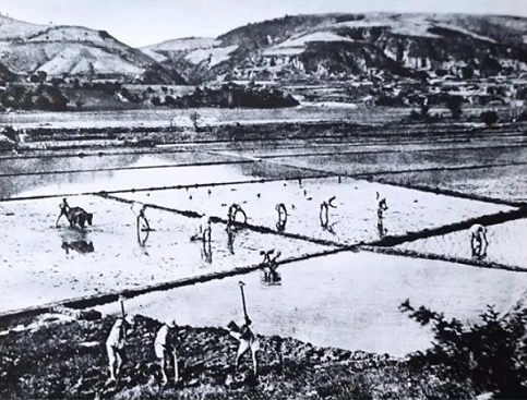 毛澤東(左二)等人在大生產(chǎn)運動中開荒種地