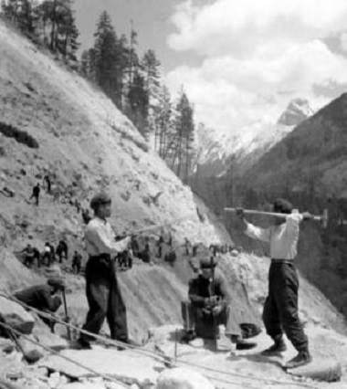 1954年,筑路大軍修筑康藏公路(1955年改名為川藏公路)的場(chǎng)景